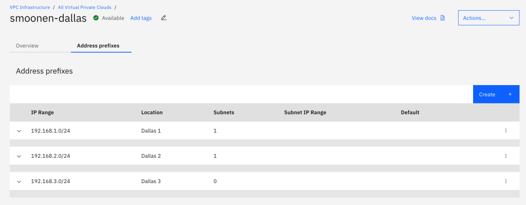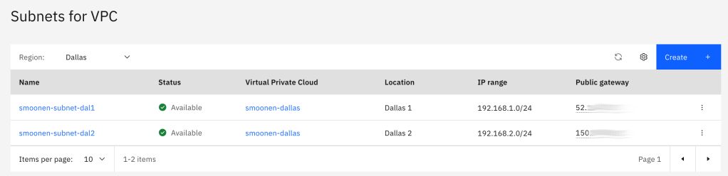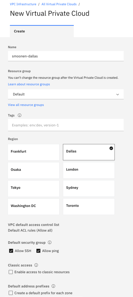 Create a VPC in Dallas or Frankfurt. The VPC will automatically generate address prefixes and subnets for you; I recommend you de-select “Create a default prefix for each zone” so that you can choose your own later: