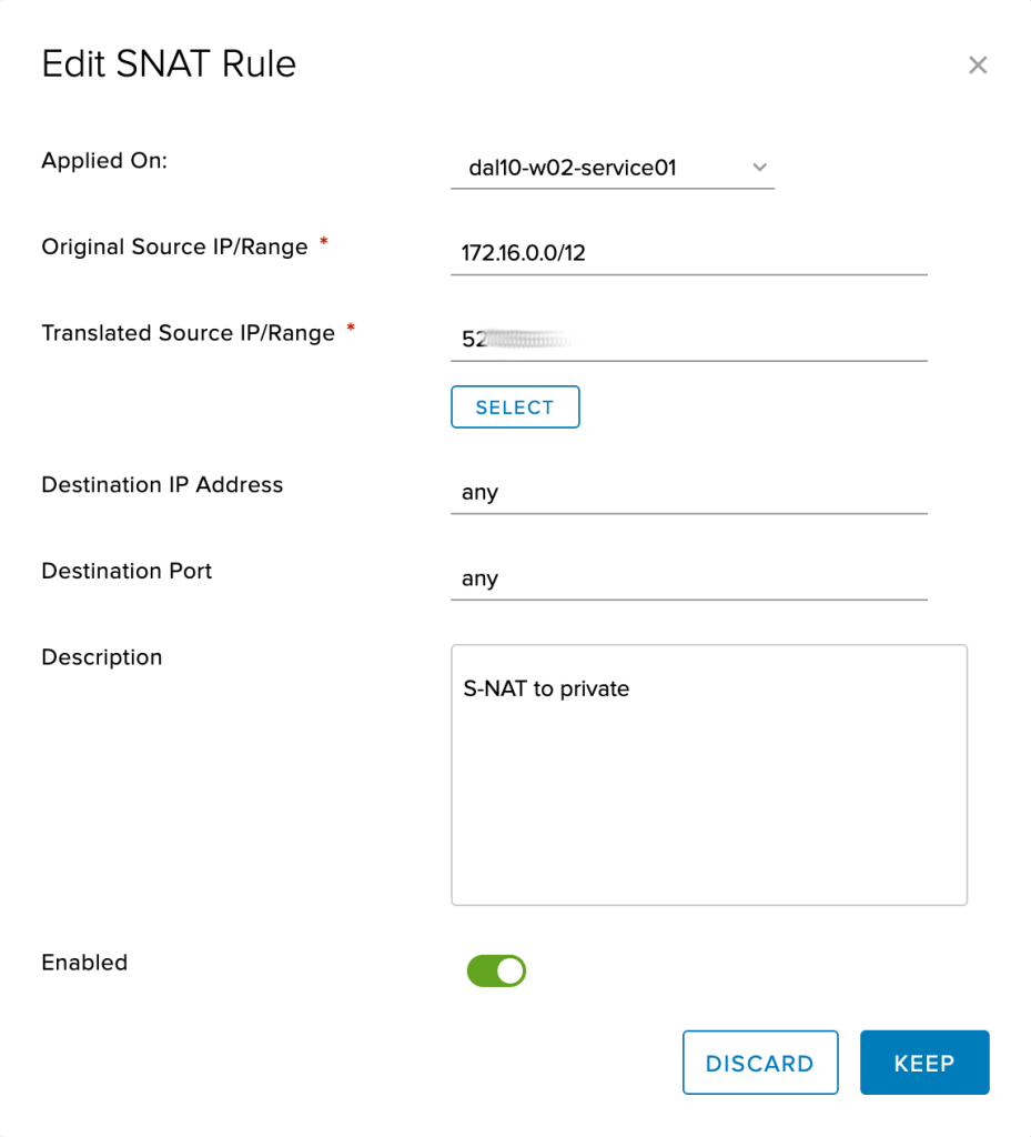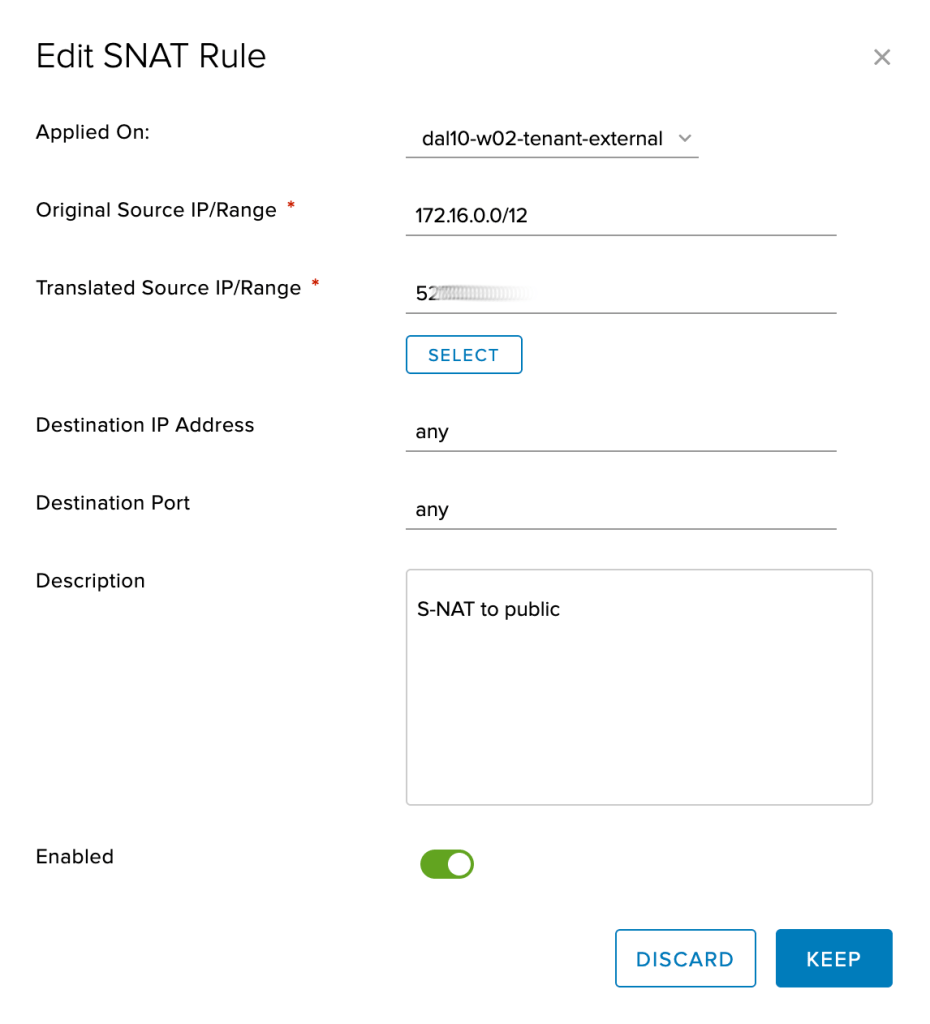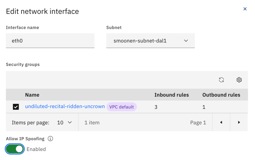 Next, configure your DAL10 and DAL12 edges (see IBM Cloud docs for details) to allow and to SNAT egress traffic from your VPC to the IBM Cloud service network (e.g., for DNS and RedHat Satellite) and to the public network. If you wish to DNAT traffic from the public internet to reach your virtual machines, keep in mind that the DAL10 edge is the active edge and you should not use DAL12 for ingress except in case of DAL10 failure.