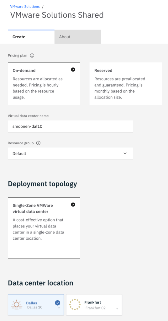 IBM Cloud offers IBM–managed VMware Cloud Director through its VMware Solutions Shared offering. This offering is currently available in IBM Cloud’s Dallas and Frankfurt multi-zone regions, enabling you to deploy VMware virtual machines across three availability zones in those regions.