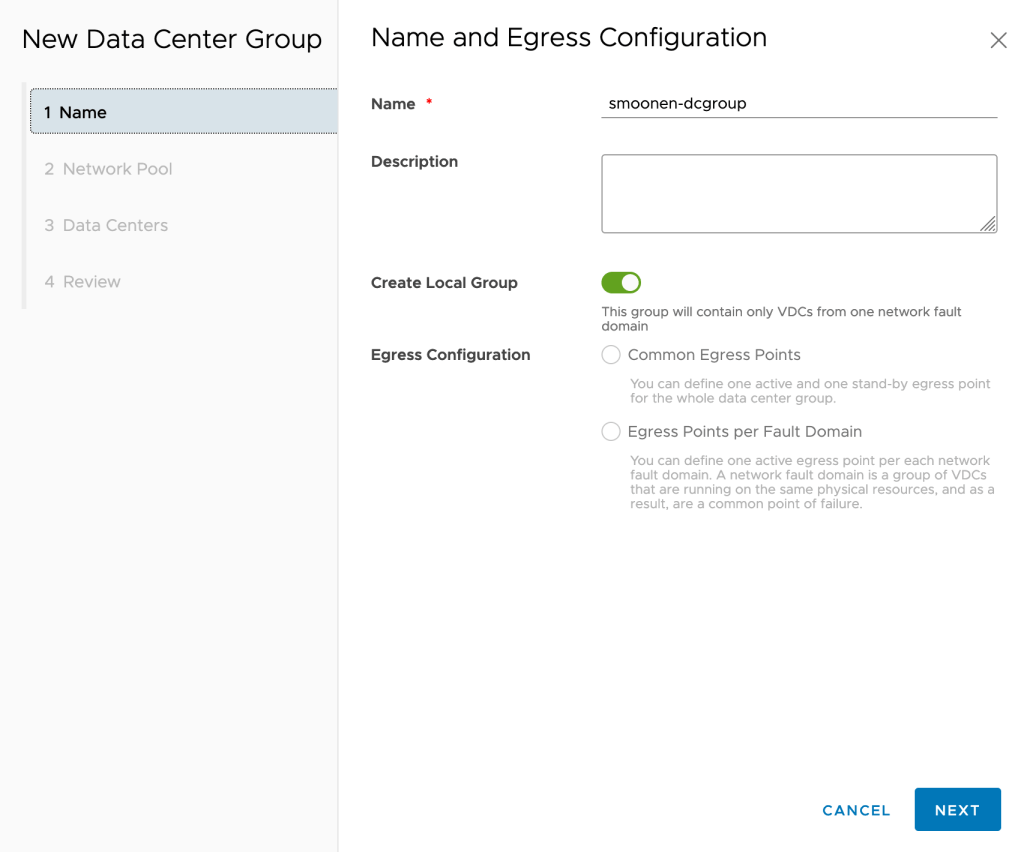Next, use these credentials to login to the Cloud Director console. We will create a Data Center Group and assign all three of our VDCs to it so that they have a shared stretch network and network egress. Navigate to Data Centers | Data Center Groups and create a new data center group. Ensure that you select the “Create Local Group” option; although the VDCs are actually in different availability zones, they are designated in the same fault domain from a Cloud Director perspective and we will use active-standby routing. There is only one network pool available for you to use: