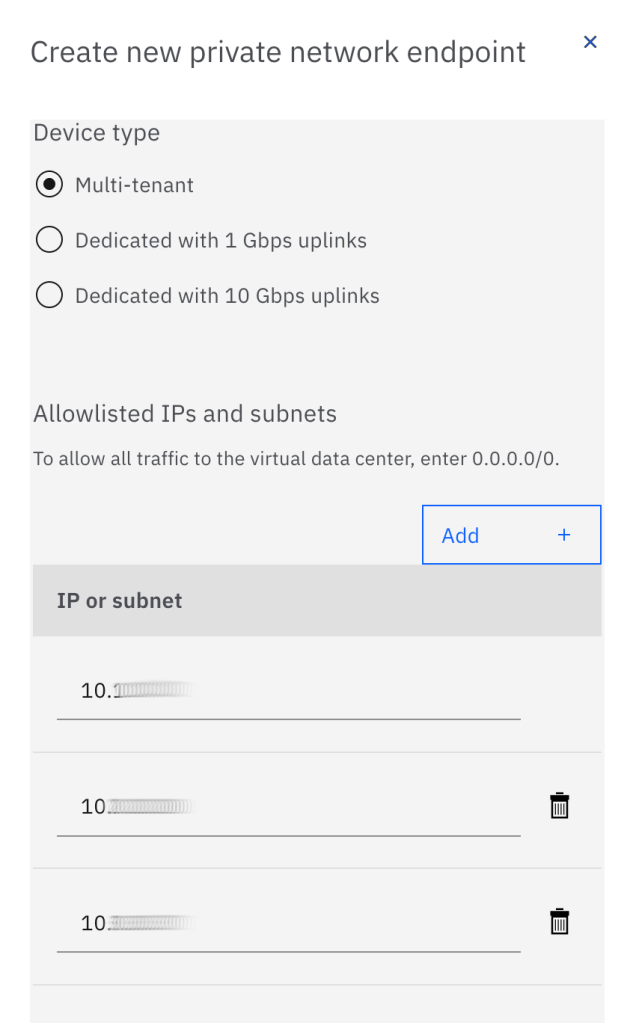 Now, navigate to your DAL10 and DAL12 VDCs in the IBM Cloud console and click “Create a private network endpoint.” Select the device type of your choice and enter the IP addresses you noted above: