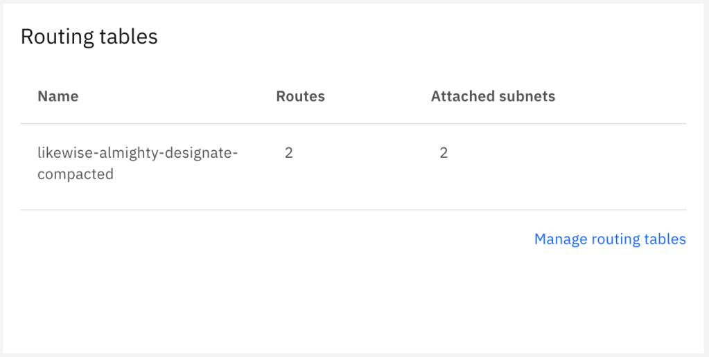 Finally, you need to visit the IBM Cloud console and find the route table configuration for your VPC: