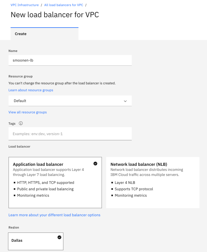 Finally, create an IBM Cloud load balancer instance pointing to each of your application VSIs. Because this is a multi-zone load balancer you must use the DNS-based application load balancer: