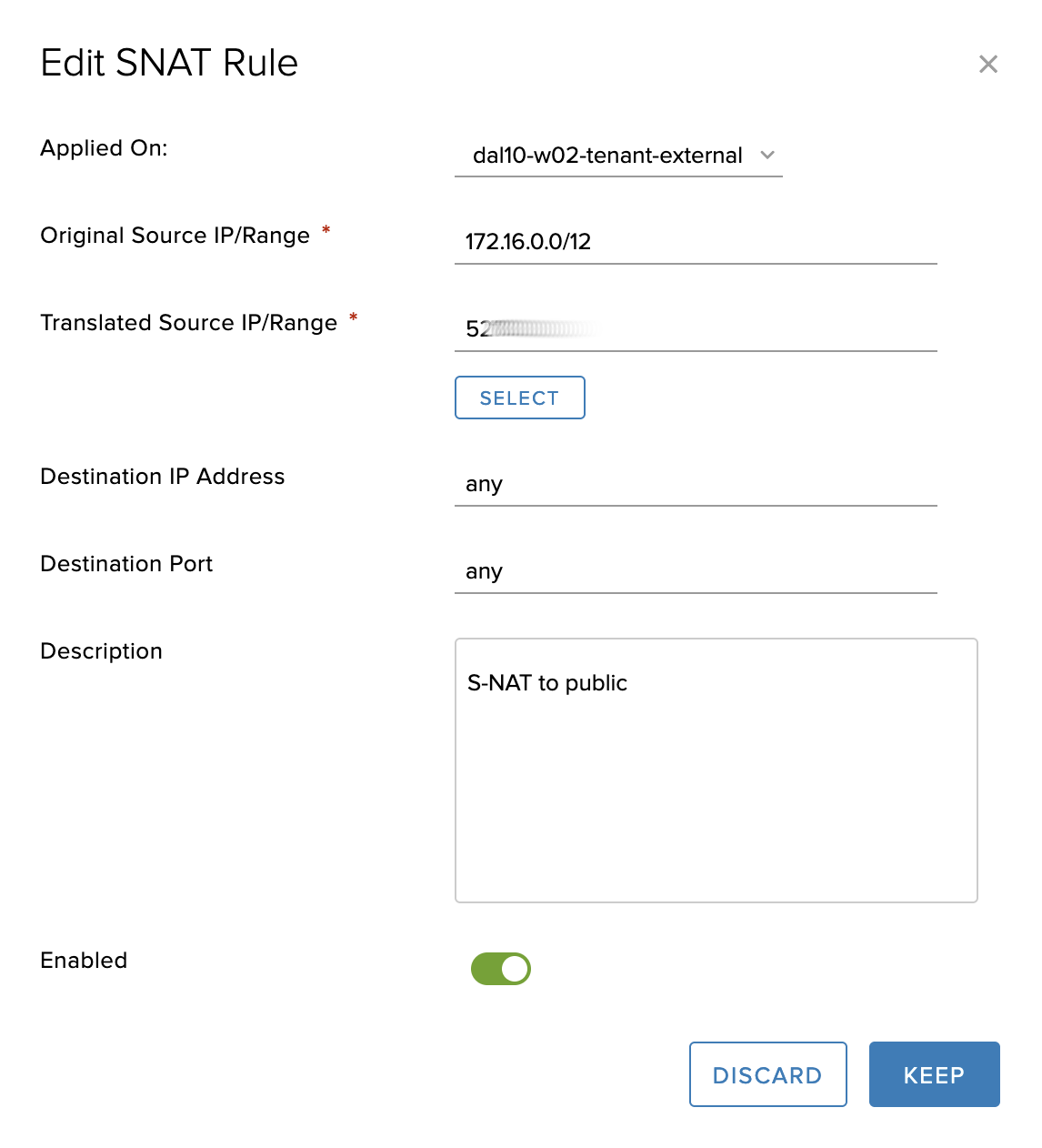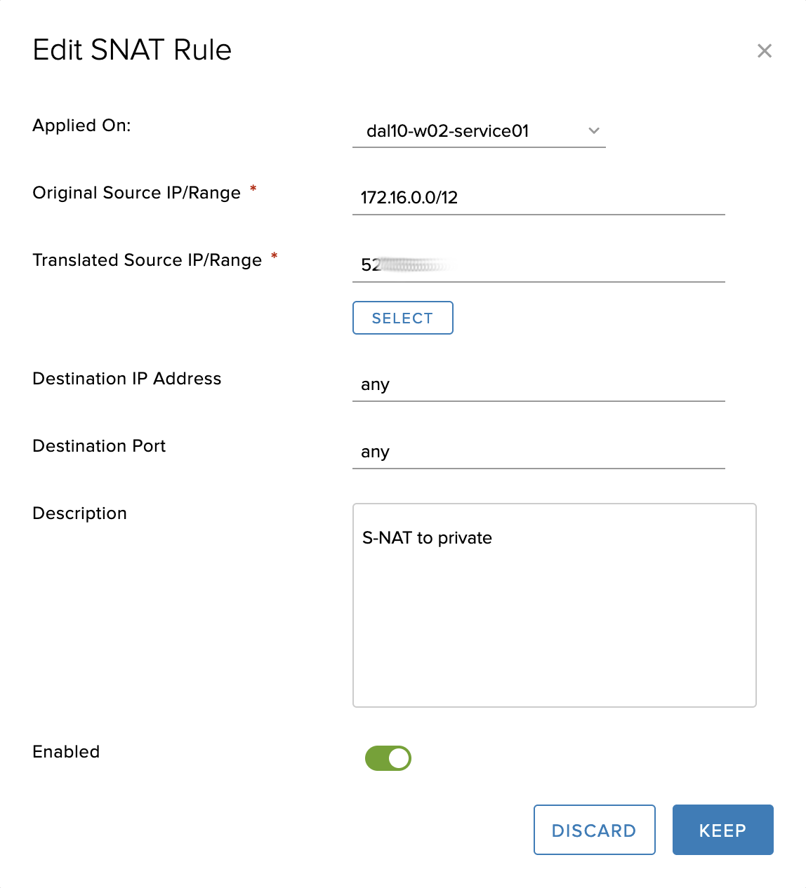 Next, configure your DAL10 and DAL12 edges (see IBM Cloud docs for details) to allow and to SNAT egress traffic from your VPC to the IBM Cloud service network (e.g., for DNS and RedHat Satellite) and to the public network. If you wish to DNAT traffic from the public internet to reach your virtual machines, keep in mind that the DAL10 edge is the active edge and you should not use DAL12 for ingress except in case of DAL10 failure.
