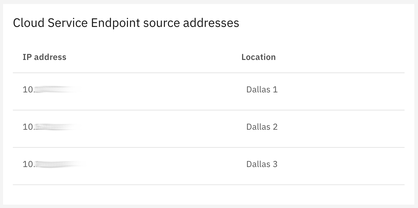 In order to expose your Cloud Director edges to your VPC using the IBM Cloud private network, you must create private network endpoints (PNEs) for your DAL10 and DAL12 VDCs. First, in the IBM Cloud console, view your VPC details. A panel on that page lists the “Cloud Service Endpoint service addresses” which are addresses not visible to your VPC but which are the addresses representing your VPC that you will need to permit to access your PNEs. Take note of these addresses: