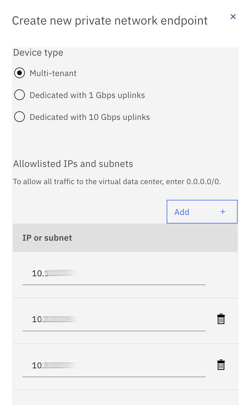 Now, navigate to your DAL10 and DAL12 VDCs in the IBM Cloud console and click “Create a private network endpoint.” Select the device type of your choice and enter the IP addresses you noted above: