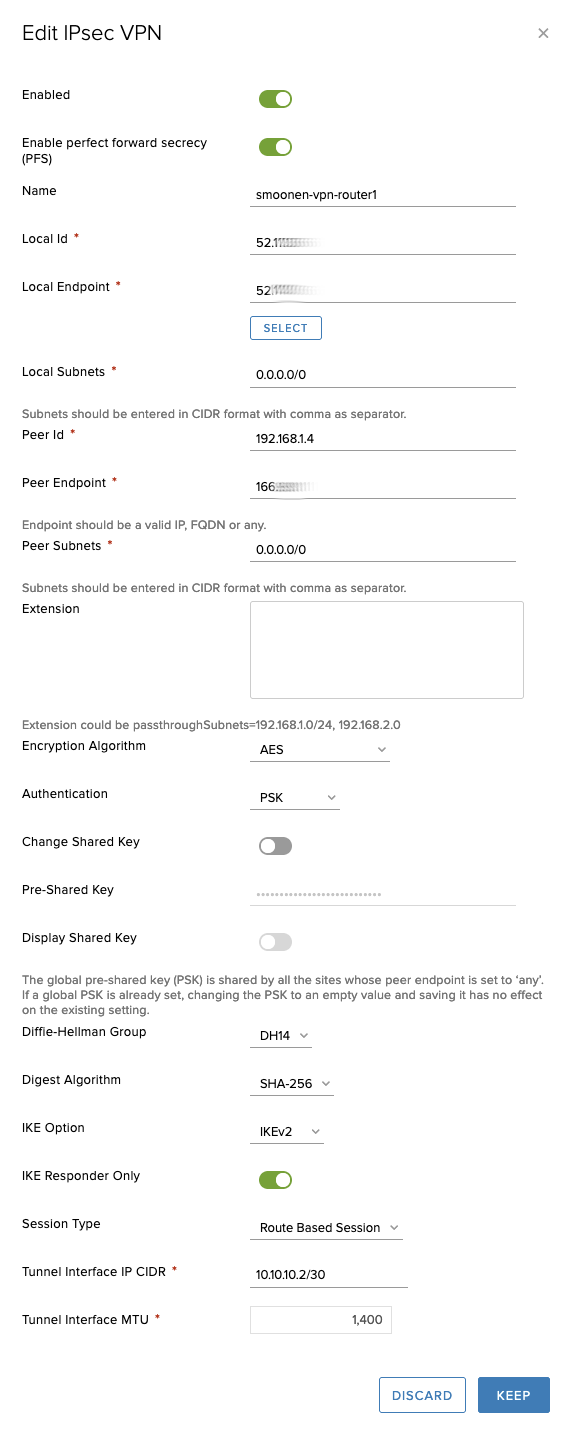 On the VCD side, the IPsec VPN site configuration for one of the VPC routers looks as follows. In this case, the 52.x address is the PNE’s “service network IP” and the 166.x address is the PNE’s “private network IP:”