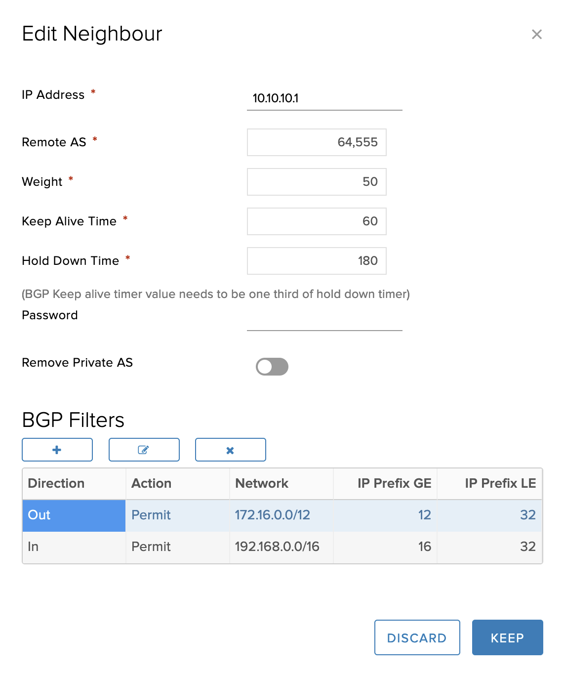 hostname smoonen-router1 router bgp 64555 bgp router-id 10.10.10.1 network 10.10.10.0/30 network 10.10.10.4/30 network 192.168.1.0/24 neighbor 10.10.10.2 remote-as 65010 neighbor 10.10.10.2 route-map RMAP-IN in neighbor 10.10.10.2 route-map RMAP-OUT out neighbor 10.10.10.2 soft-reconfiguration inbound neighbor 10.10.10.2 weight 2 neighbor 10.10.10.6 remote-as 65010 neighbor 10.10.10.6 route-map RMAP-IN in neighbor 10.10.10.6 route-map RMAP-OUT out neighbor 10.10.10.6 soft-reconfiguration inbound neighbor 10.10.10.6 weight 1 ip prefix-list PRFX-VCD seq 5 permit 172.16.0.0/12 le 32 ip prefix-list PRFX-VPC seq 5 permit 192.168.0.0/16 le 32 route-map RMAP-IN permit 10 match ip address prefix-list PRFX-VCD route-map RMAP-OUT permit 10 match ip address prefix-list PRFX-VPC log file /var/log/frr/bgpd.log debug