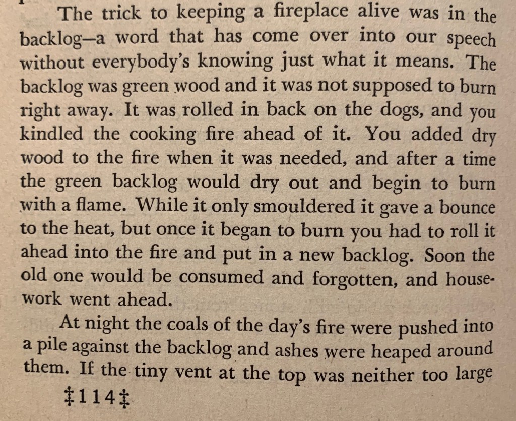 Scott Moonen in Miscellany June 16, 2023 15 Words Backlog A backlog is an actual log! From The House That Jacob Built by John Gould, 1945: Share this: Click to share on X (Opens in new window) X Click to share on Facebook (Opens in new window) Facebook Like Loading...