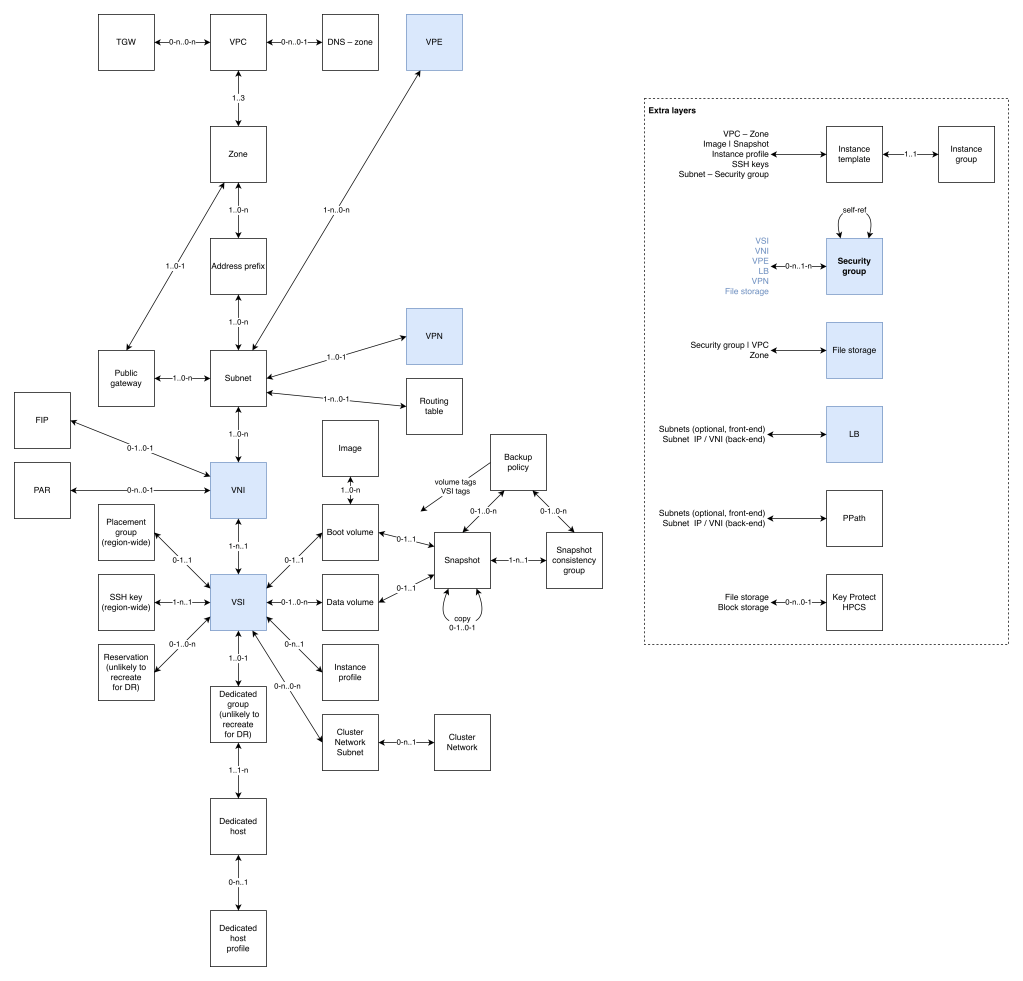 Some resources I have designated by abbreviation (e.g., VPE, LB, FIP, PAR, VNI). I have attempted to specify some cardinality based on my understanding, but it is likely that I have made some mistakes. I’ve also set aside some related resources to the side as a kind of appendix rather than attempting to include them and all of their possible relations in the main diagram. Because the security group impact is so extensive, I have used blue color coding to highlight the extent of its influence.