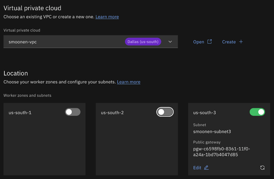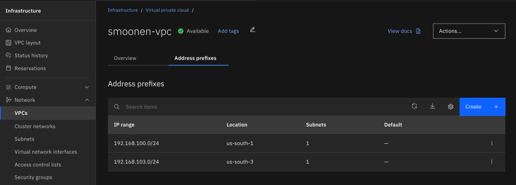 Interestingly, the address prefix is not itself a usable subnet in a zone. Instead, it is a broader construct that represents an address range out of which you can create one or more usable subnets in that zone. Therefore, you need to go to Infrastructure | Network | Subnets and create a subnet in each zone where you will be creating resources or running workloads. Note carefully that you choose the region and name of your subnet before you choose the VPC in which to create it. At that point you can choose which address prefix it should draw from. In my case I used up the entire address prefix for each of my subnets.
