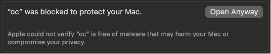 In my case, on MacOS, I had to override the security checks for downloaded software. I attempted to run oc and received an error. I then opened the System Settings app, selected Privacy & Security, scrolled to the bottom, and selected “Open Anyway” for oc.
