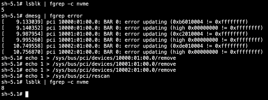 At the time of this writing, recent CoreOS kernel versions appear to have a bug where several NVMe drives are not properly mounted. After the cluster is provisioned, login to the OpenShift web console and use the Terminal feature on each host to display whether your system has all of its NVMe disks. For example, the profile I deployed should have 8 disks. If there are missing disks, follow the steps in the screenshot below to rediscover them, using the ids from the error messages.