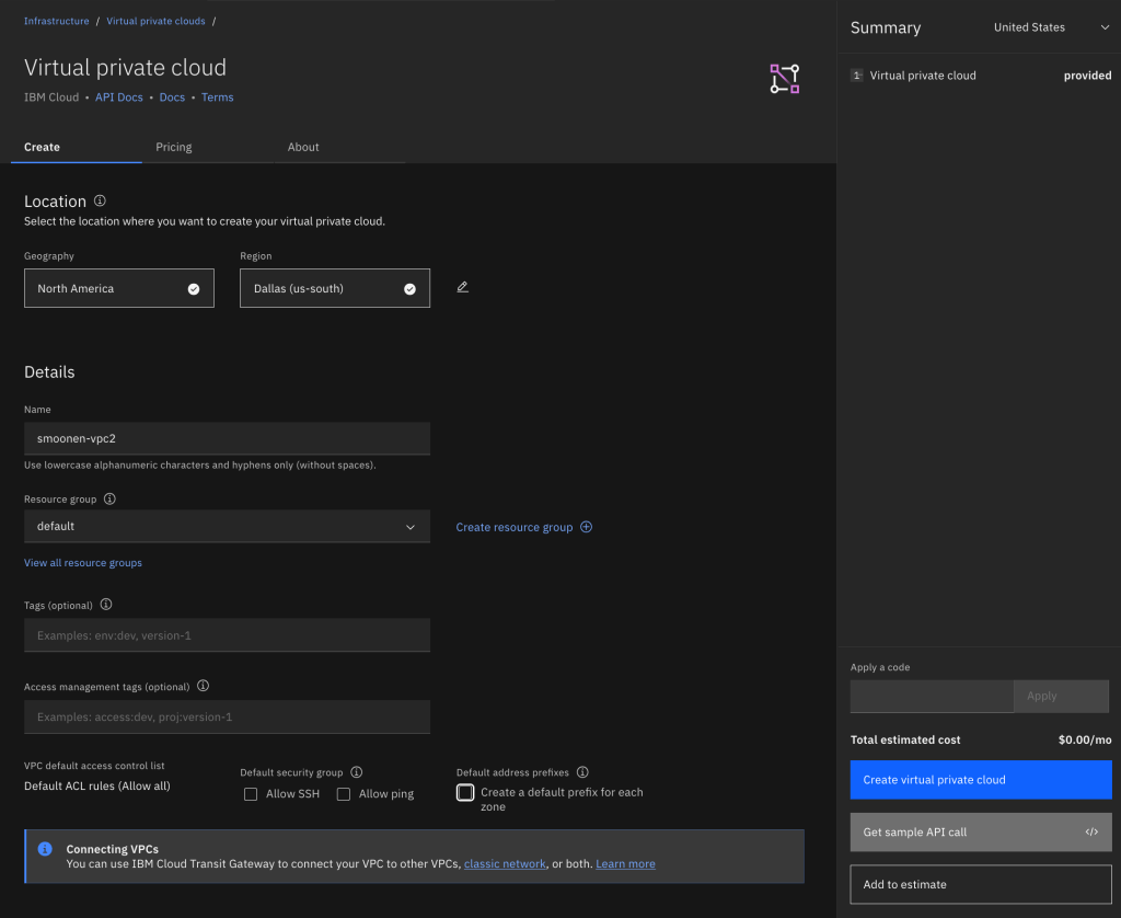 IBM Cloud offers the opportunity to create virtual private clouds, which are software-defined network bubbles where you provision cloud resources and infrastructure into a network address space allocated and managed by you. For some more background, read and watch “What is a virtual private cloud?”
