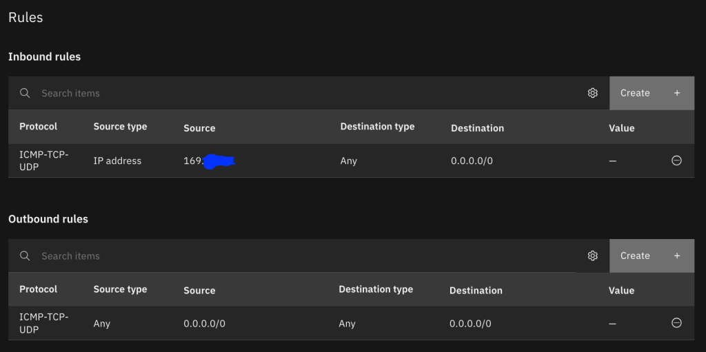 First you should create a security group to restrict access to the jump server. Navigate to Infrastructure | Network | Security groups and click Create. Ensure that your new VPC is selected, create one or more rules to represent the allowed inbound connections, and then create an outbound rule allowing all traffic.