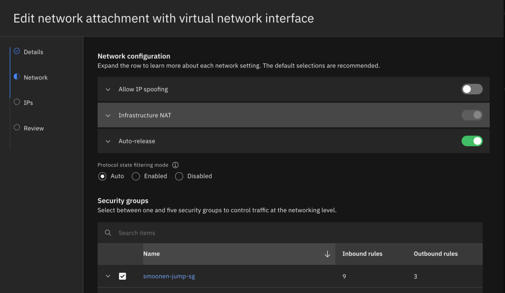 It is fine to take most of the default settings for network and storage unless you prefer to select a specific IP from your subnet. However, you do need to edit the network attachment and select the security group you created above instead of the VPC default group. You’ll notice that the creation of your VSI results in the creation of something called a virtual network interface, or VNI. The VNI is an independent object that mediates the VSI’s attachment to an IP address in your subnet. VNIs serve as an abstract model for such attachments and can be attached to other resources such as file storage and bare metal servers. You could elect to allow spoofing on your VNI (which would be necessary if you wanted your VSI to share a VIP with other VSIs or to route traffic for additional IPs and networks), and also to allow the VNI to continue to exist even after the VSI is deleted.