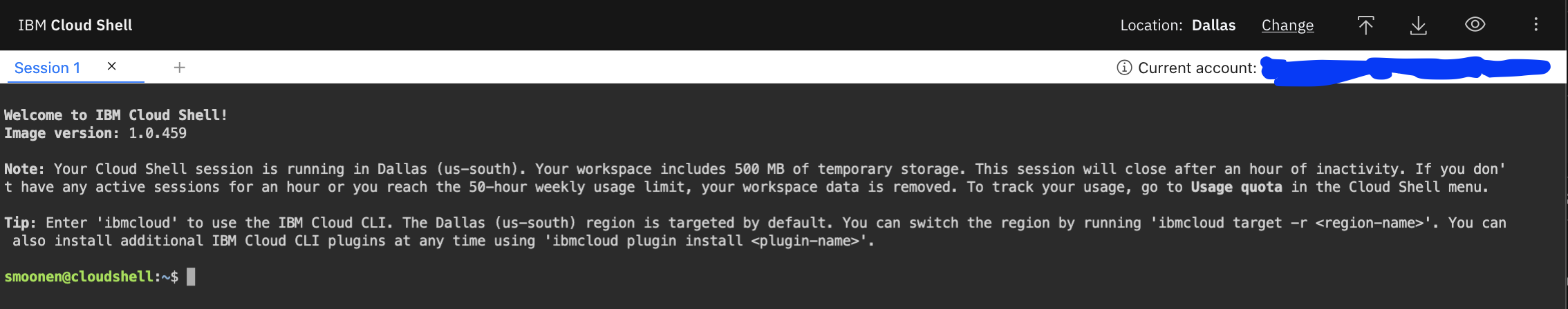 Click the IBM Cloud Shell icon in the top right corner of the IBM Cloud UI. This will open a new tab in your browser. Ensure that your region of choice is selected.