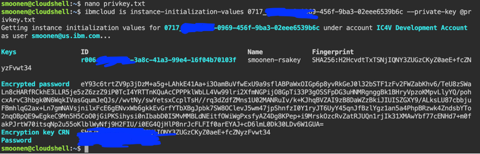 ibmcloud is instance-initialization-values 0717_368f7ea8-0879-465f-9ab3-02ede6549b6c --private-key @privkey.txt