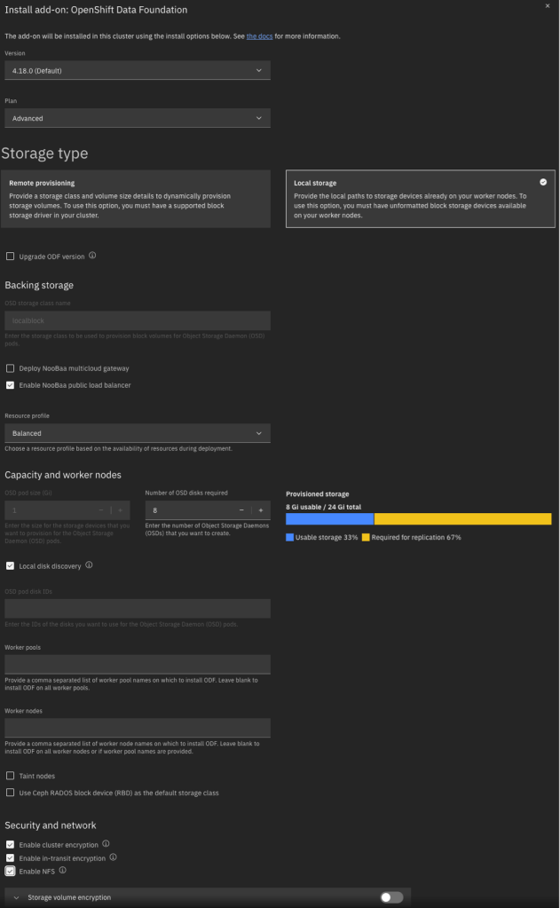 Below is an example of the input parameters I used. Note that I did not enable volume encryption because the integration with KP and HPCS was not clear to me. Most importantly, you should be careful with the pod configuration. For local storage, ignore the fact that the pod size appears to be 1GiB. This simply indicates the minimum claim that ODF will attempt; in reality it will be greedy and will make use of your entire NVMe drive. Also for the number of pods, specify the number of NVMe disks on each host that you want to consume. Although I have three hosts, I have 8 NVMe disks on each host and wish to use all of them. For this reason I specified a pod count of 8.