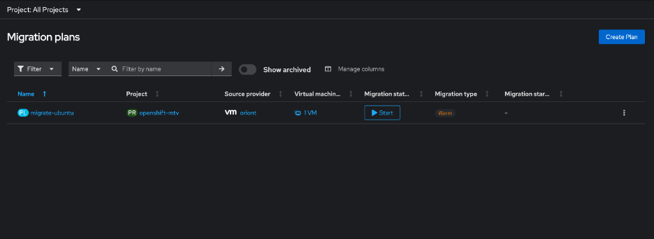 In my migration plan I chose to migrate the VM to the default project. My migration plan actually failed to initialize because it could not retrieve the VDDK image that had been built for me. Either before or after creating the migration plan, run the following command to ensure that it can access the cluster’s image registry:
