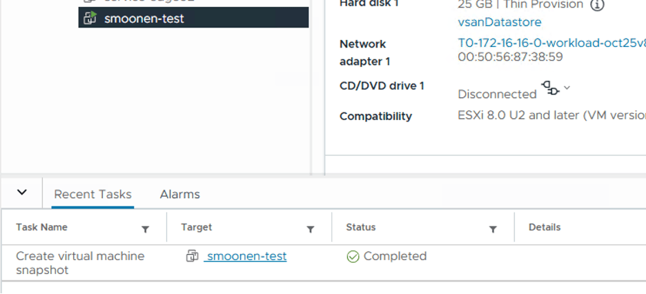 The cutover resulted in the stopping of my VM on the VMware side, the removal of the snapshot, and the creation and removal of an additional snapshot; I presume this represented the replication of the remaining data as signaled by CBT.