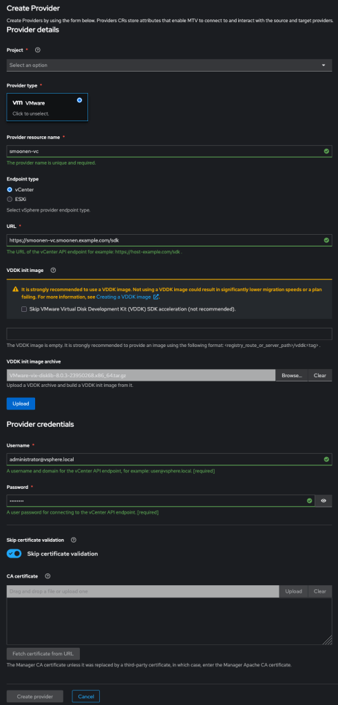 In order to create a migration provider, RedHat recommends you create a “VDDK image.” Recent versions of the Migration operator will build this for you, and all you need to do is provide the VDDK toolkit downloaded from Broadcom. See RedHat’s instructions.